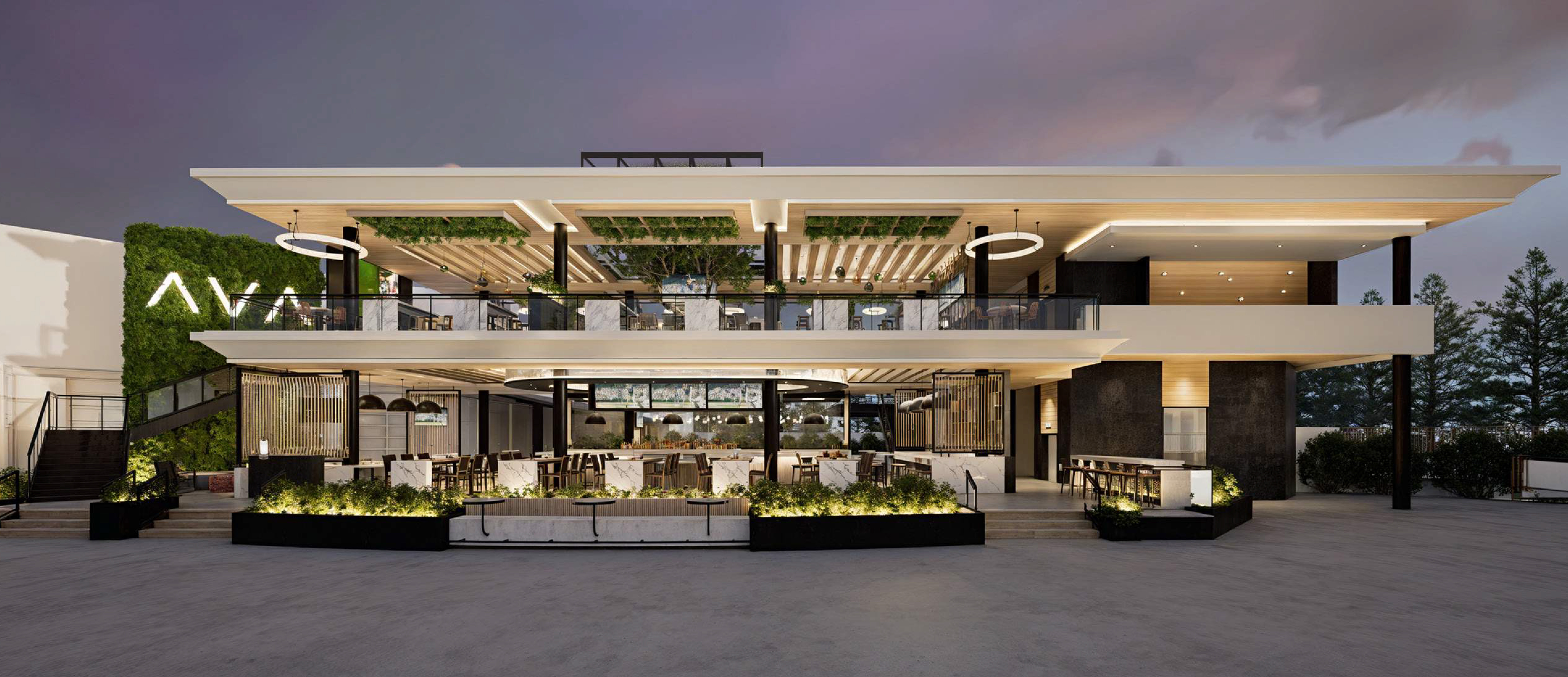 A two-story, open-air rooftop lounge located in the plaza, offering stunning views of the stadium district.