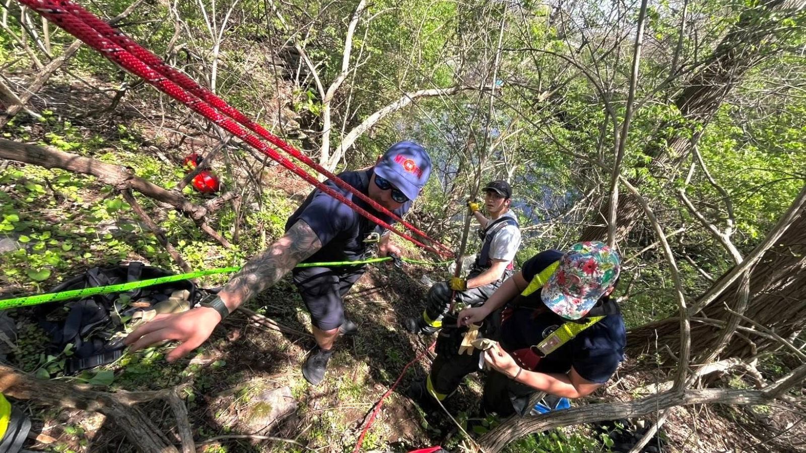 “A tree was utilized as a secure anchor point, and crews set up a twin tension rope system. A rescuer was lowered to the dog and owner, where a bridle was placed on the canine using an Anderson Rescue Solutions, LLC MLRS and it was integrated into the rope system alongside the rescuer,” officials wrote.