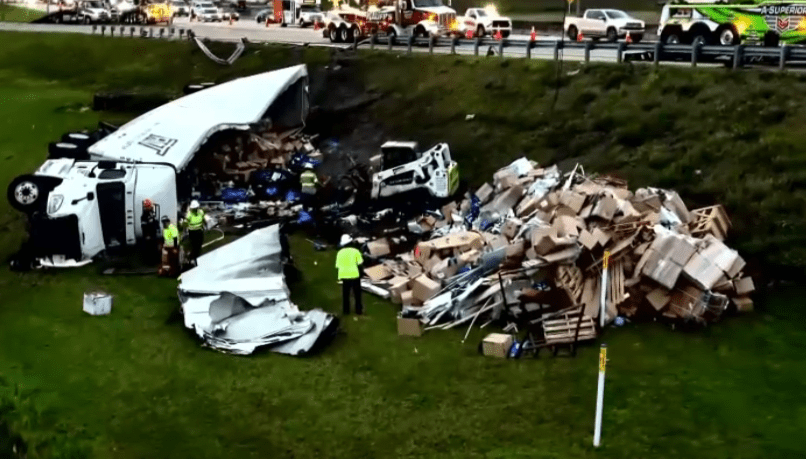 Aerial video showed the truck lying in the embankment below the roadway, its contents spilled out onto the grass.